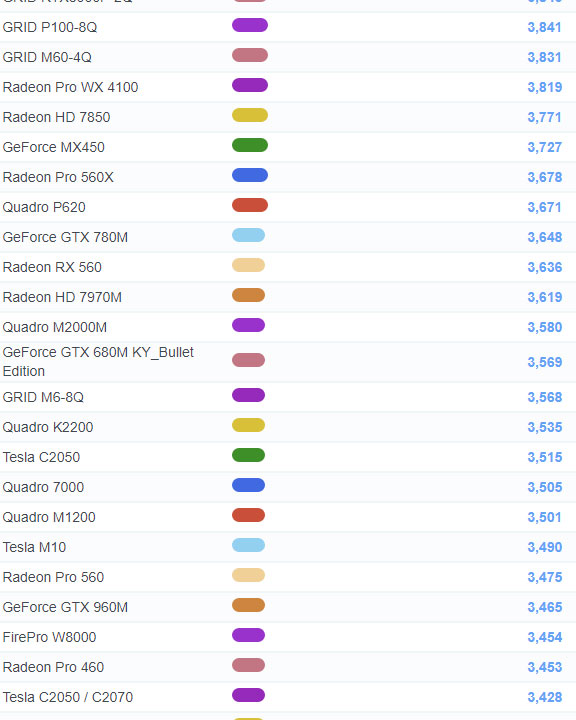 | 554 | Radeon Pro WX 4150 | 1,785 |