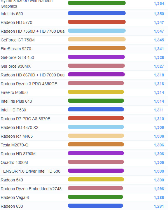| 629 | Radeon Ryzen 3 4300G | 1,435 |