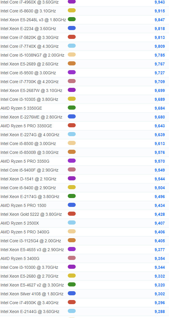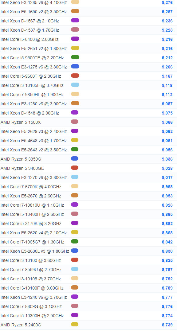 | 867 | Intel Xeon E-2104G @ 3.20GHz | 6,215 |