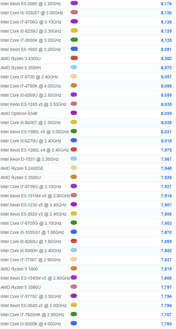 | 808 | Intel Core i5-10310U @ 1.70GHz | 6,689 |