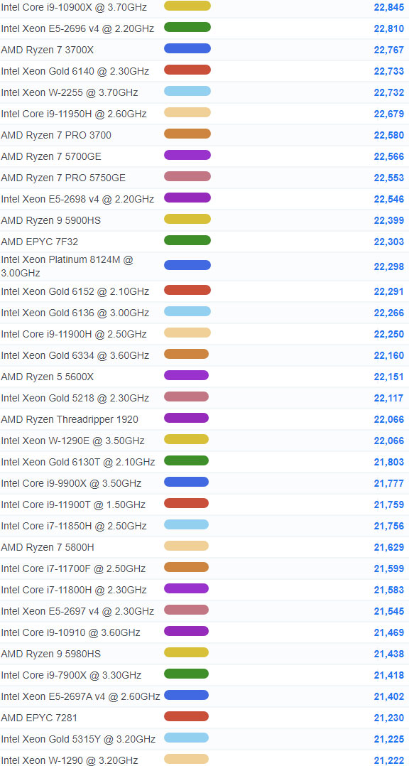 | 69 | Intel Xeon W-2295 @ 3.00GHz | 31,602 |