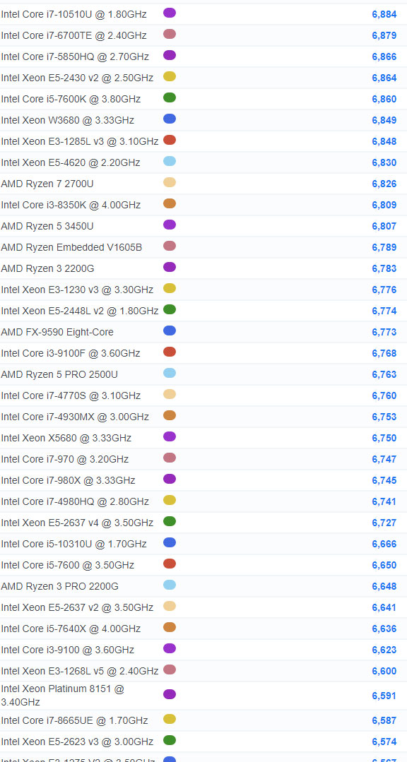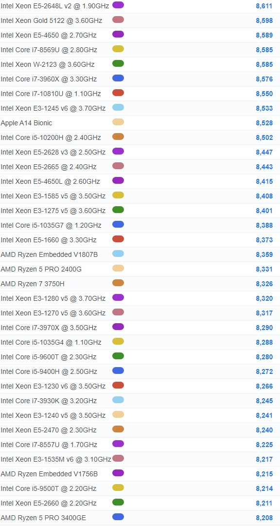 | 860 | Intel Core i7-8665U @ 1.90GHz | 6,529 |