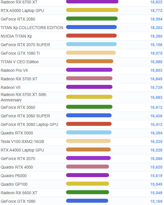 | 19 | Radeon PRO W6800 | 18,968 |