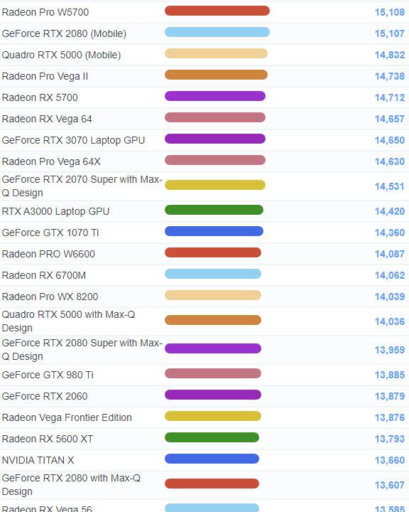 | 45 | Radeon Pro W5700 | 15,108 |