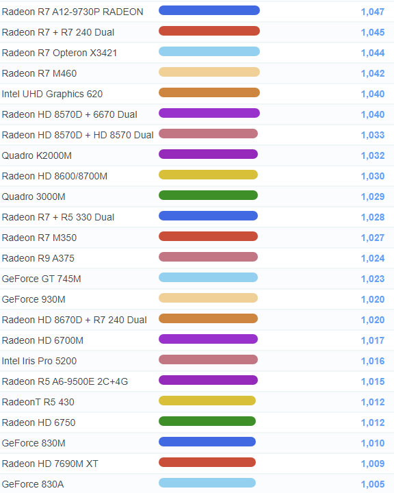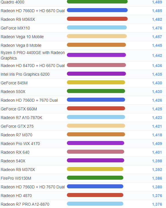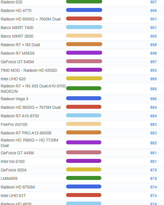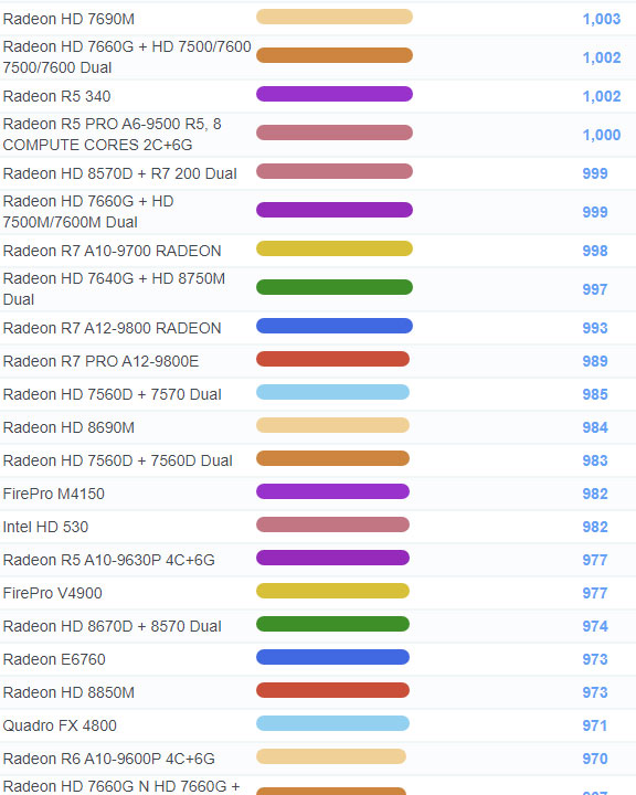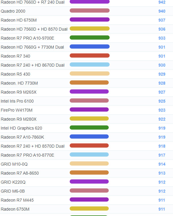 | 627 | Radeon R7 M465X | 1,598 |