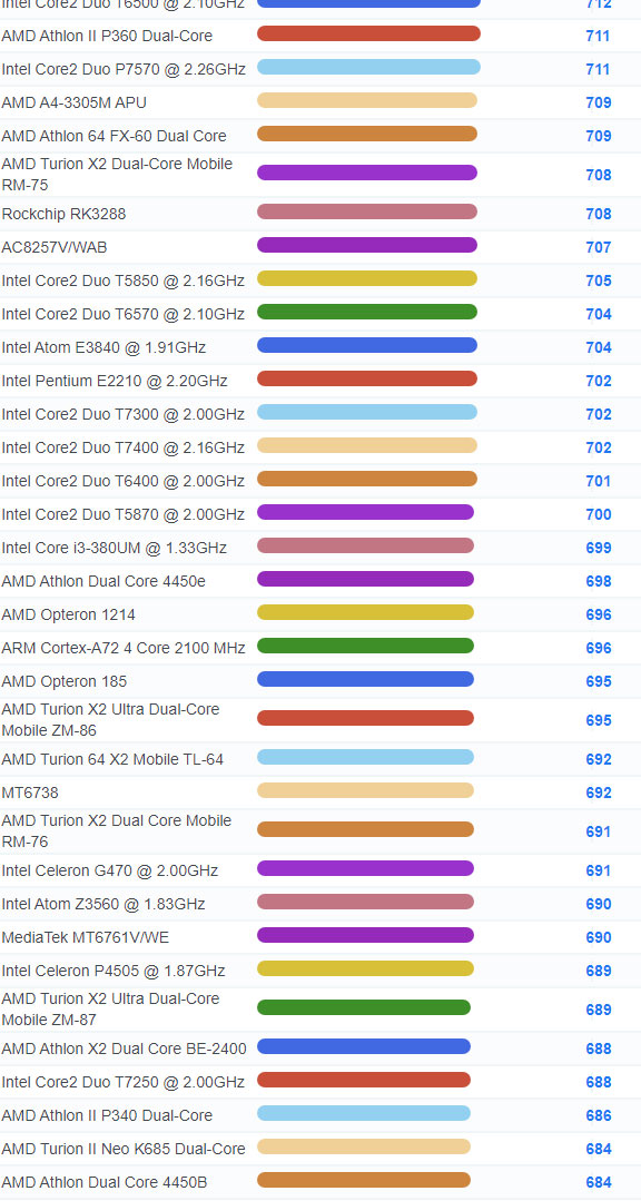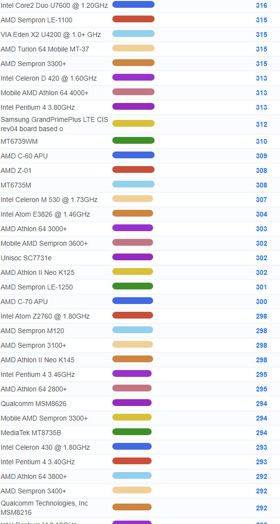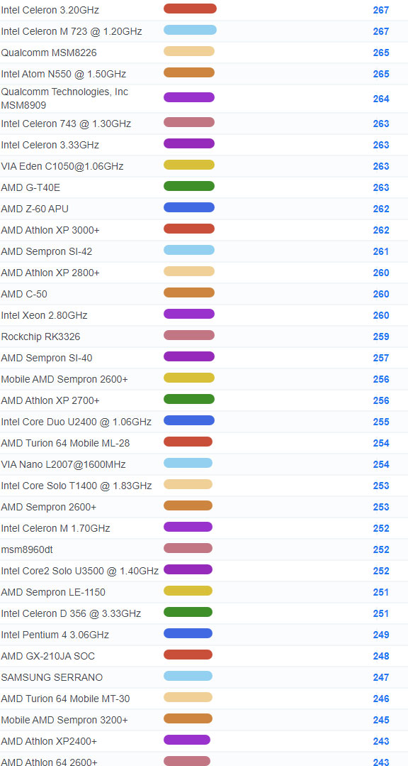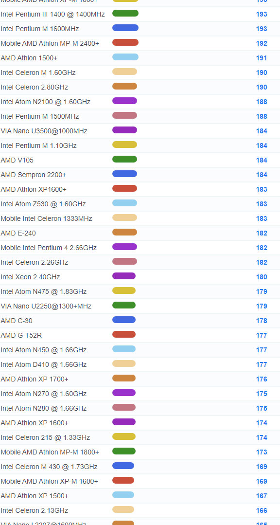 | 3671 | Intel Core Solo U1300 @ 1.06GHz | 127 |