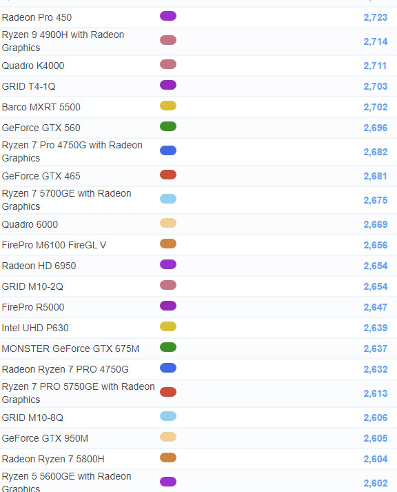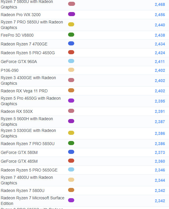 | 505 | Radeon Pro Ryzen 7 PRO 5850U | 2,217 |