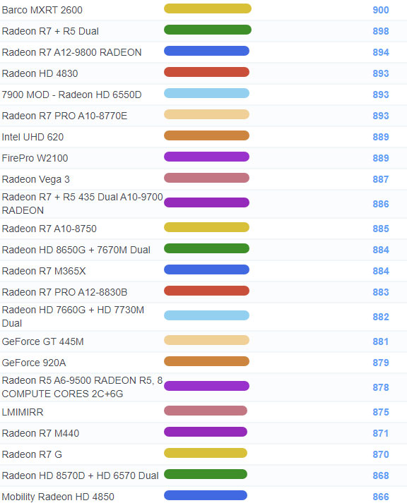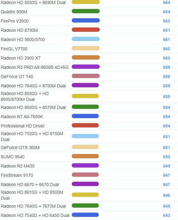 | 1104 | Radeon HD 8650G + R5 M230 Dual | 686 |