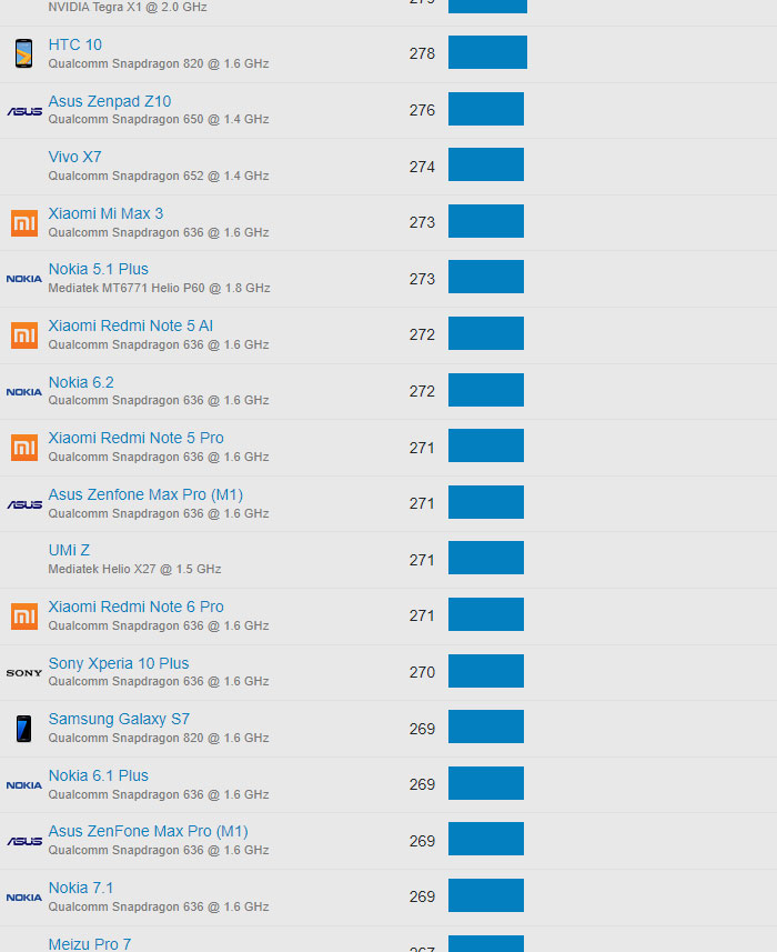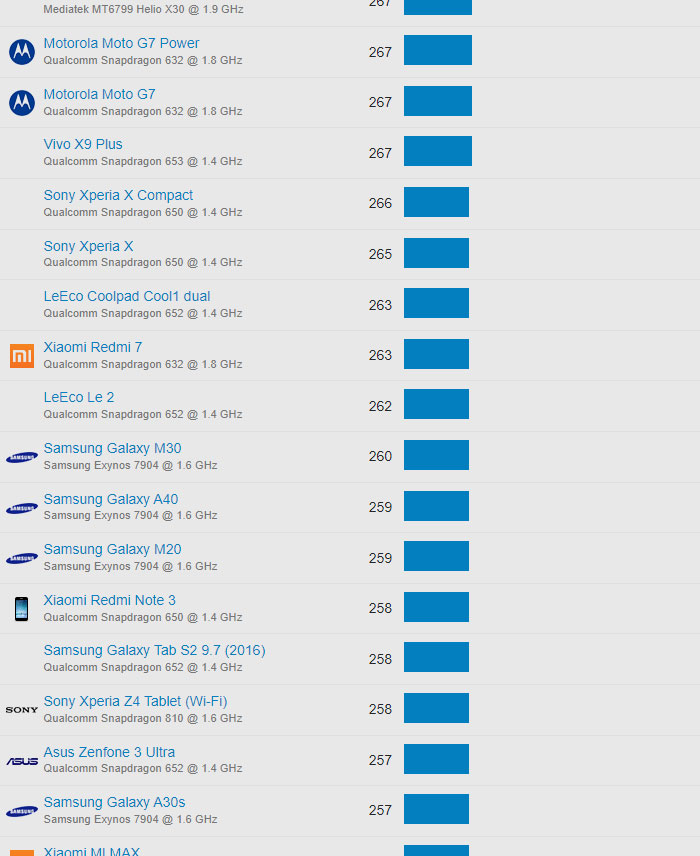 | 609 | Motorola Moto G6 Play | Qualcomm Snapdragon 430 @ 1.4 GHz | 105 |