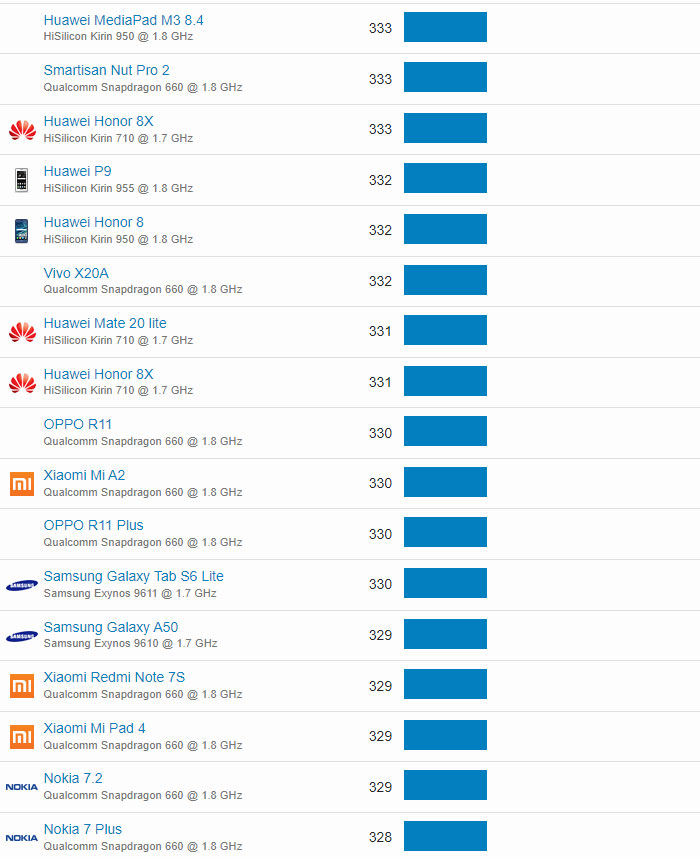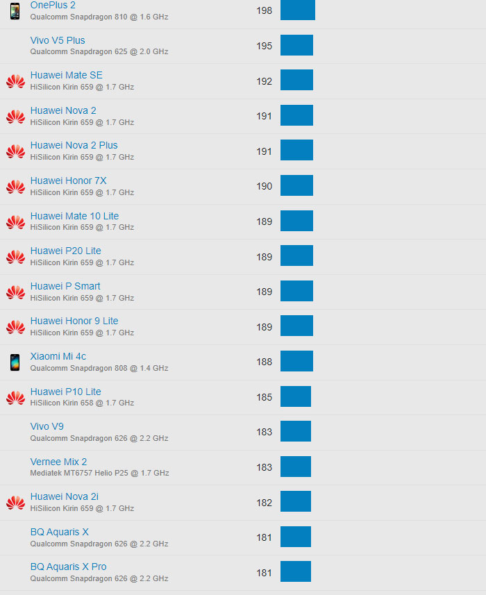 | 610 | Huawei Honor 6A | Qualcomm Snapdragon 430 @ 1.4 GHz | 105 |