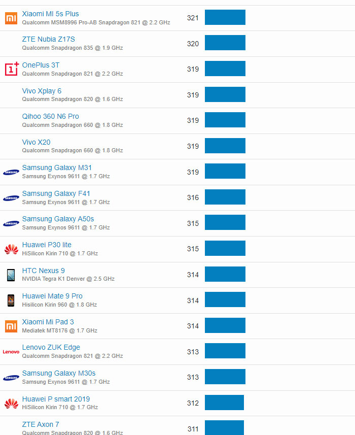 | 38 | Xiaomi Mi 11X | Qualcomm Snapdragon 870 @ 1.8 GHz | 856 |