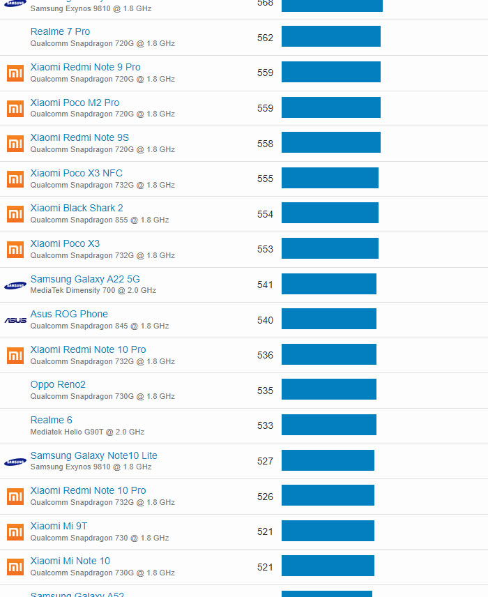 | 21 | Xiaomi Poco F3 | Qualcomm Snapdragon 870 @ 1.8 GHz | 923 |