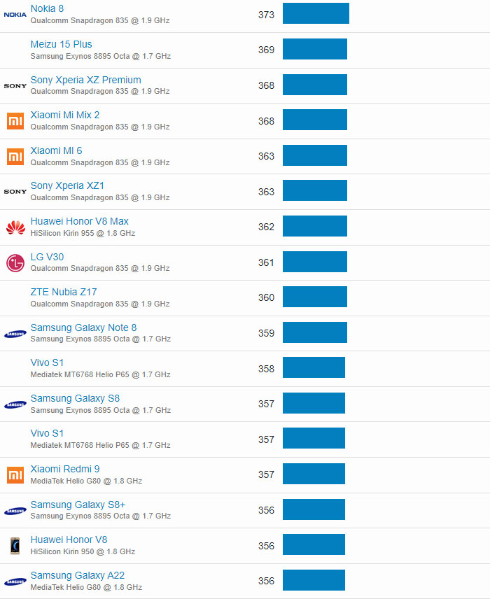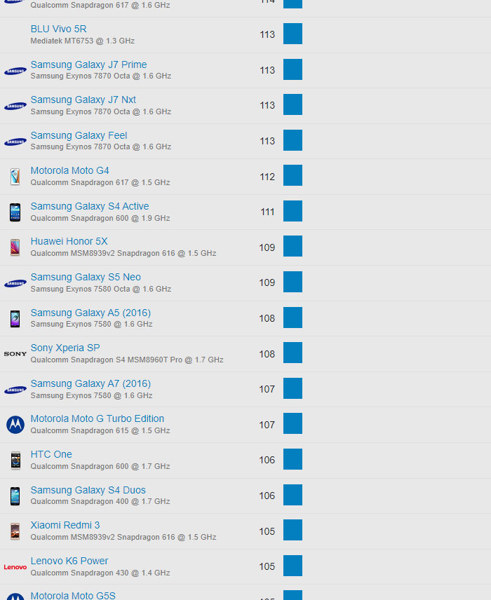 | 608 | Motorola Moto G5S | Qualcomm Snapdragon 430 @ 1.4 GHz | 105 |