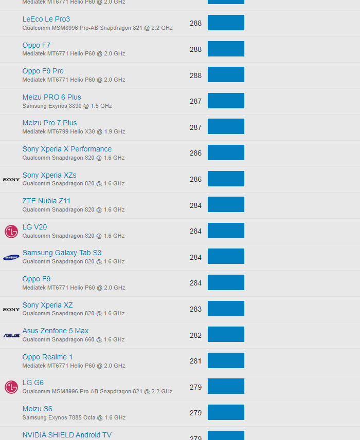 | 587 | Samsung Galaxy J7 | Qualcomm Snapdragon 617 @ 1.6 GHz | 116 |
