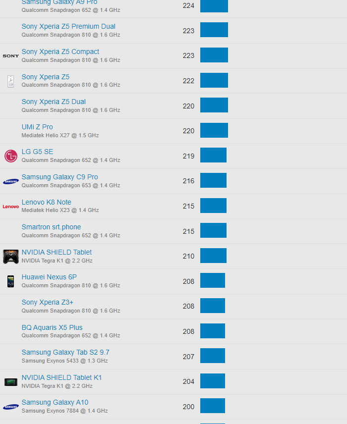 | 656 | Samsung Galaxy Tab A 9.7 | Qualcomm MSM8916 Snapdragon 410 @ 1.2 GHz | 81 |