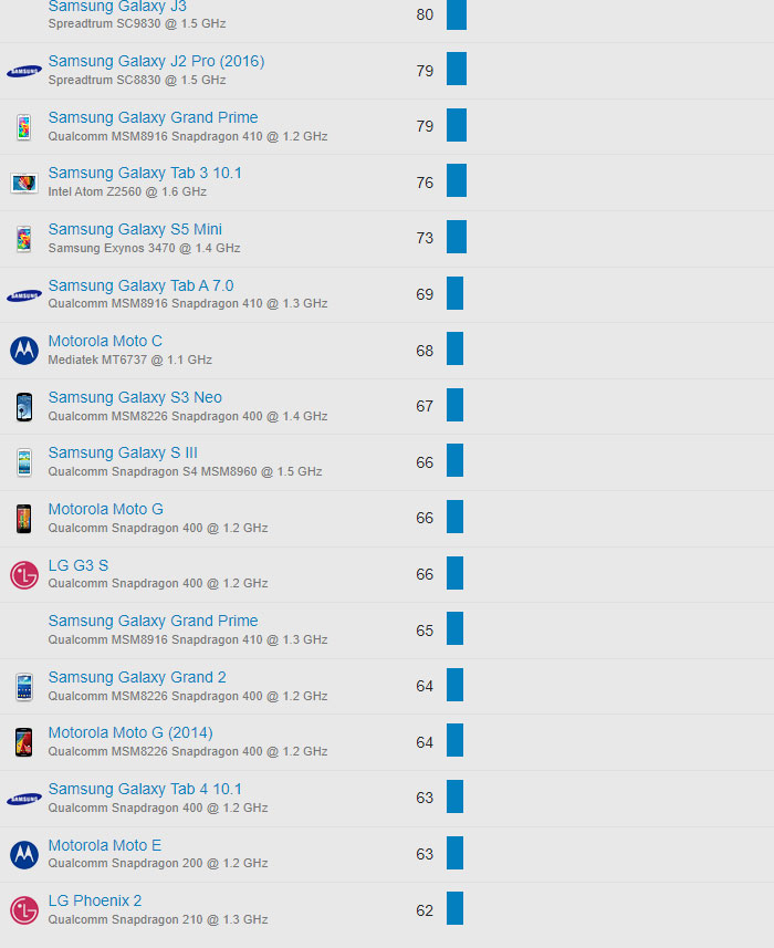| 660 | Samsung Galaxy J2 Pro (2016) | Spreadtrum SC8830 @ 1.5 GHz | 79 |