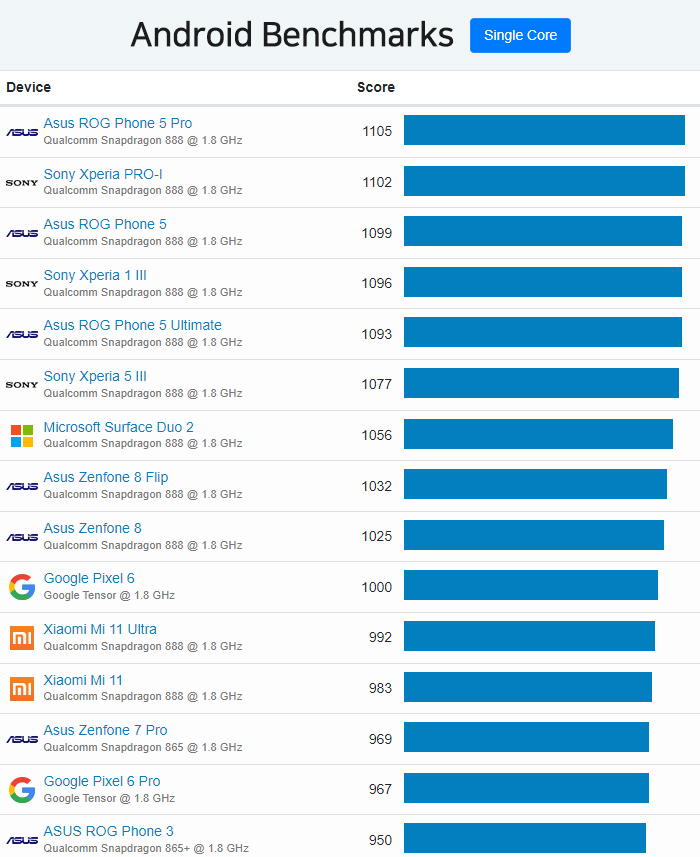 | 1 | Asus ROG Phone 5 Pro | Qualcomm Snapdragon 888 @ 1.8 GHz | 1105 |