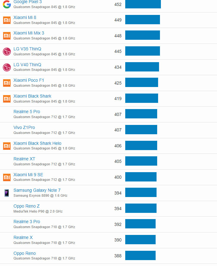 | 54 | Realme X2 Pro | Qualcomm Snapdragon 855+ @ 1.8 GHz | 746 |