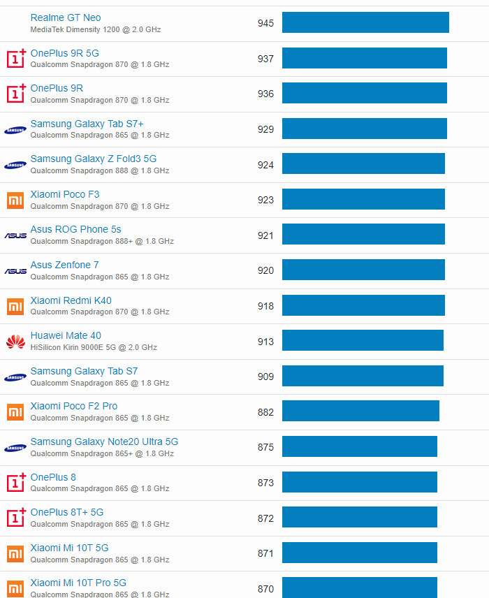 | 16 | Realme GT Neo | MediaTek Dimensity 1200 @ 2.0 GHz | 945 |
