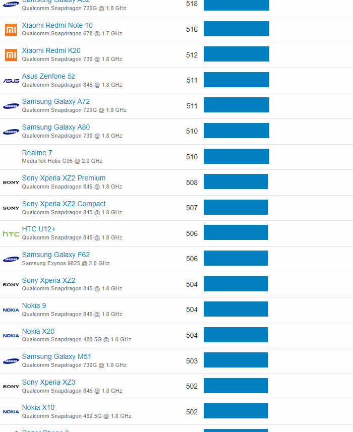 | 72 | OnePlus 7 | Qualcomm Snapdragon 855 @ 1.8 GHz | 698 |