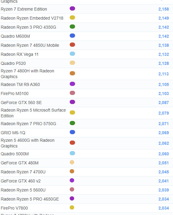 | 523 | Radeon Ryzen 5 4600G | 2,163 |