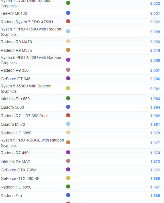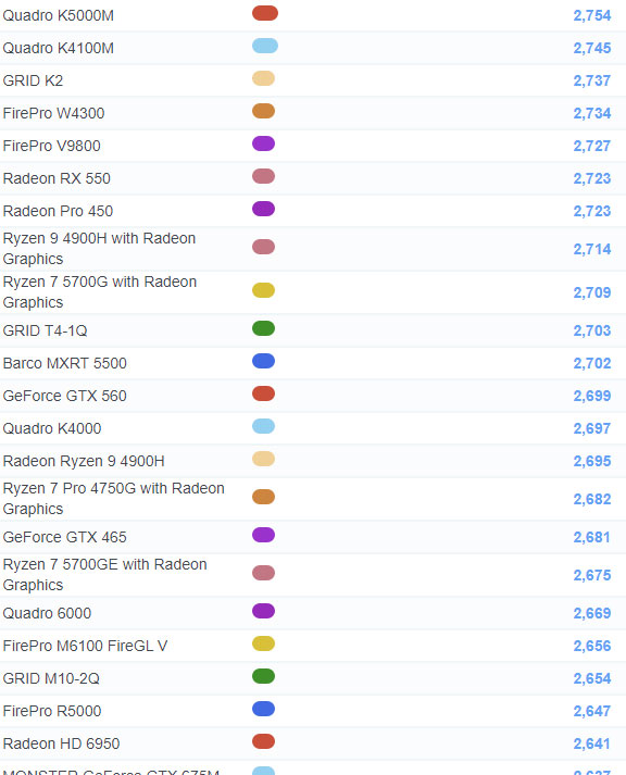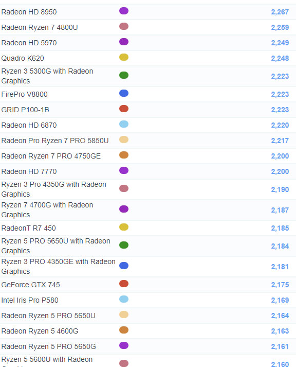 | 522 | Radeon Ryzen 5 PRO 5650U | 2,164 |