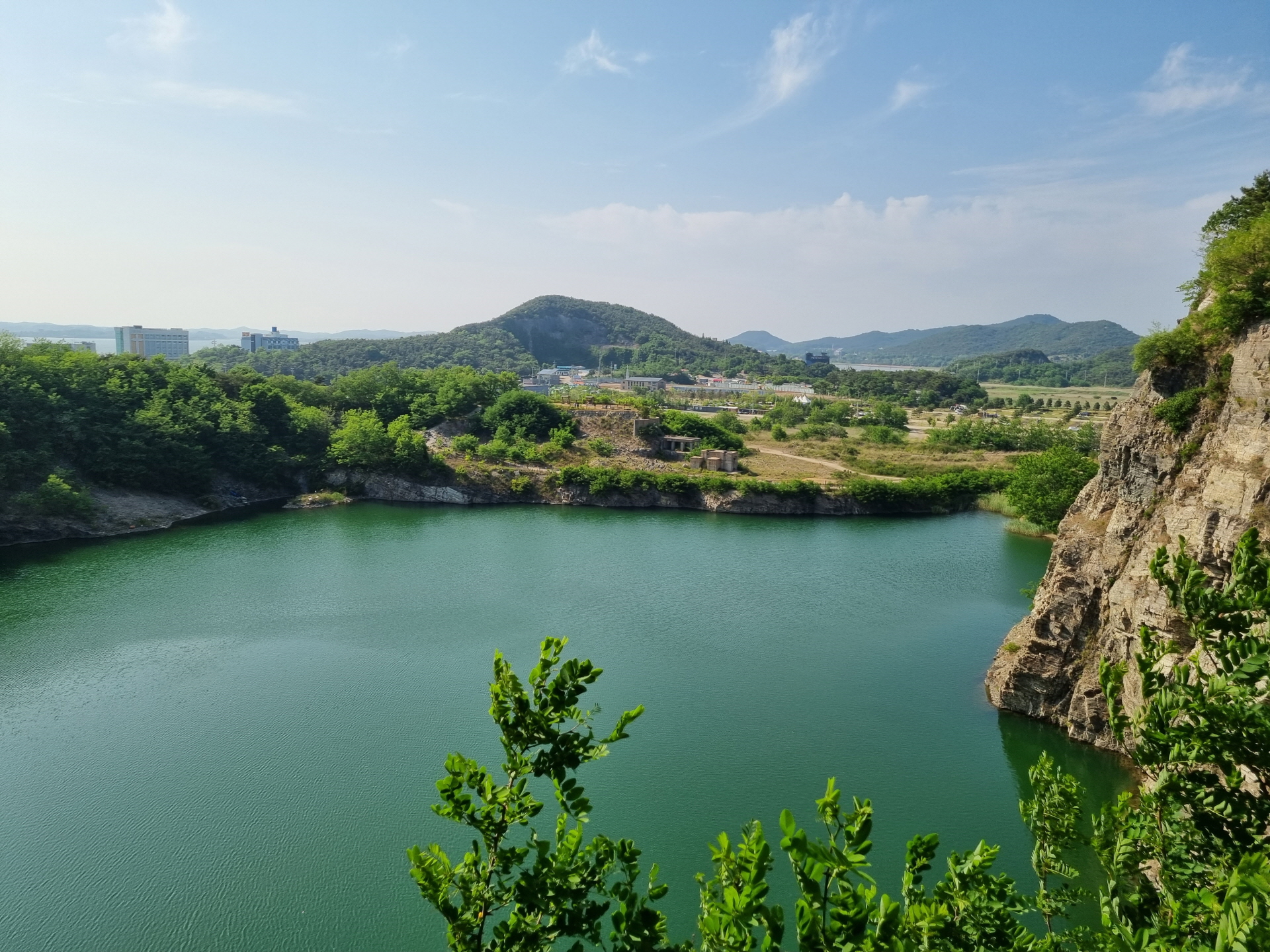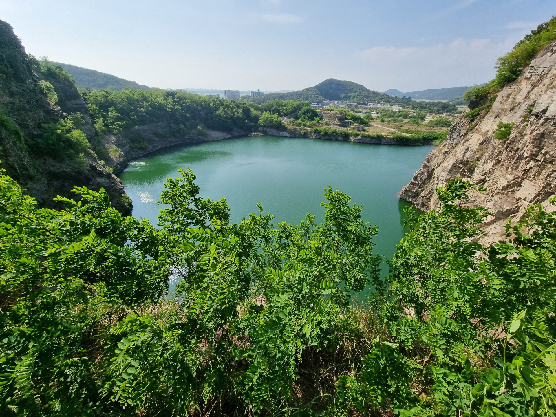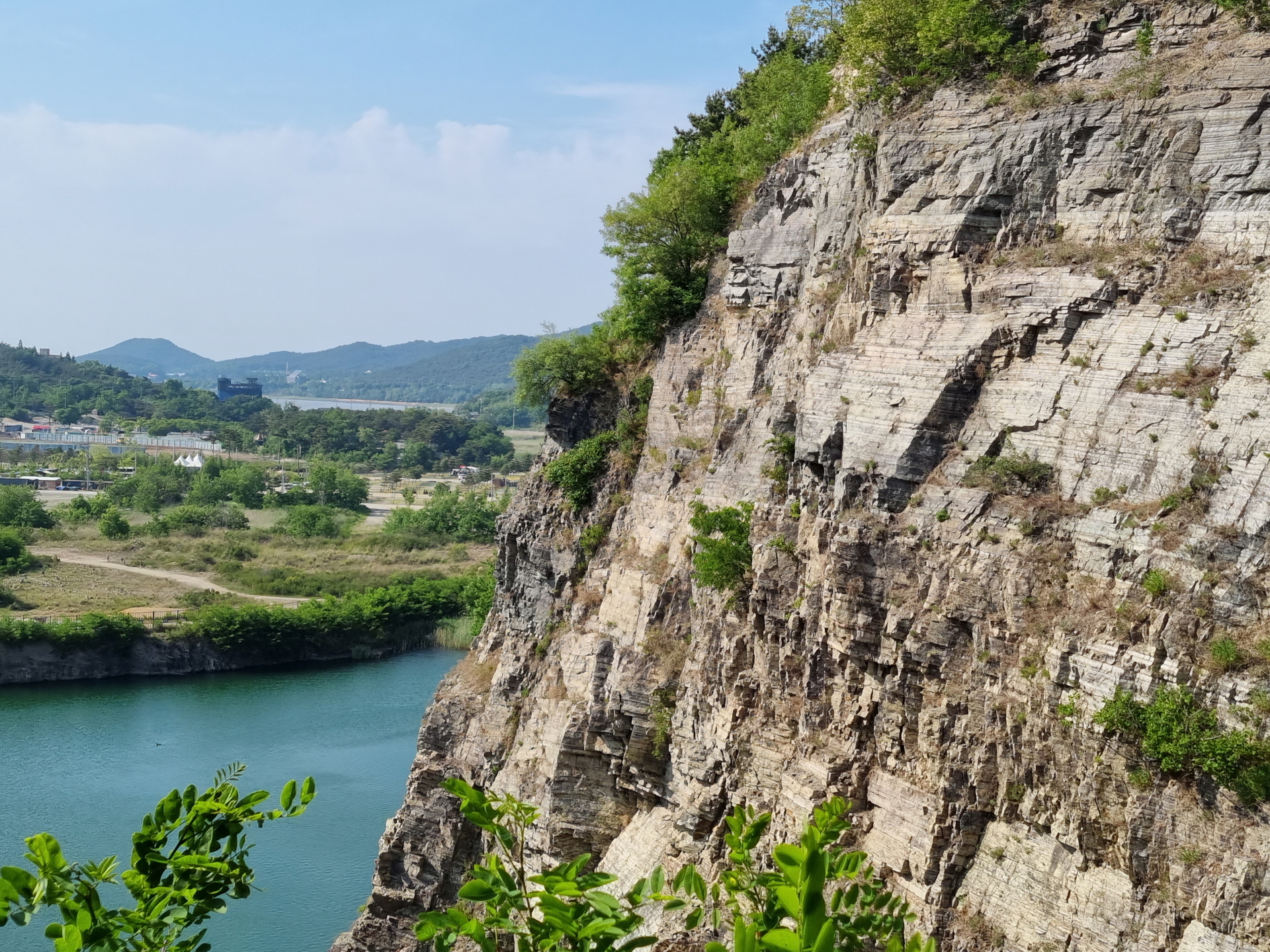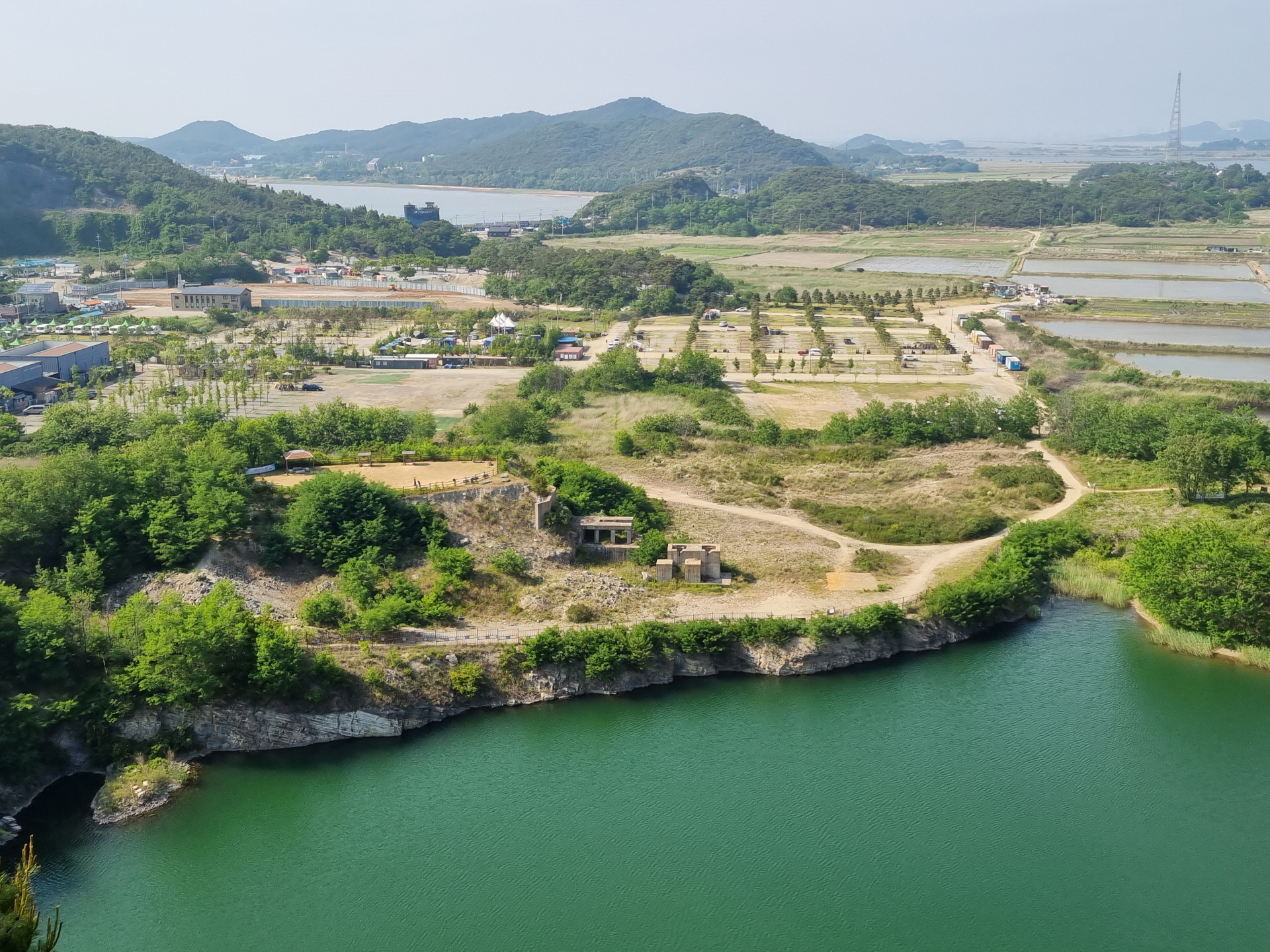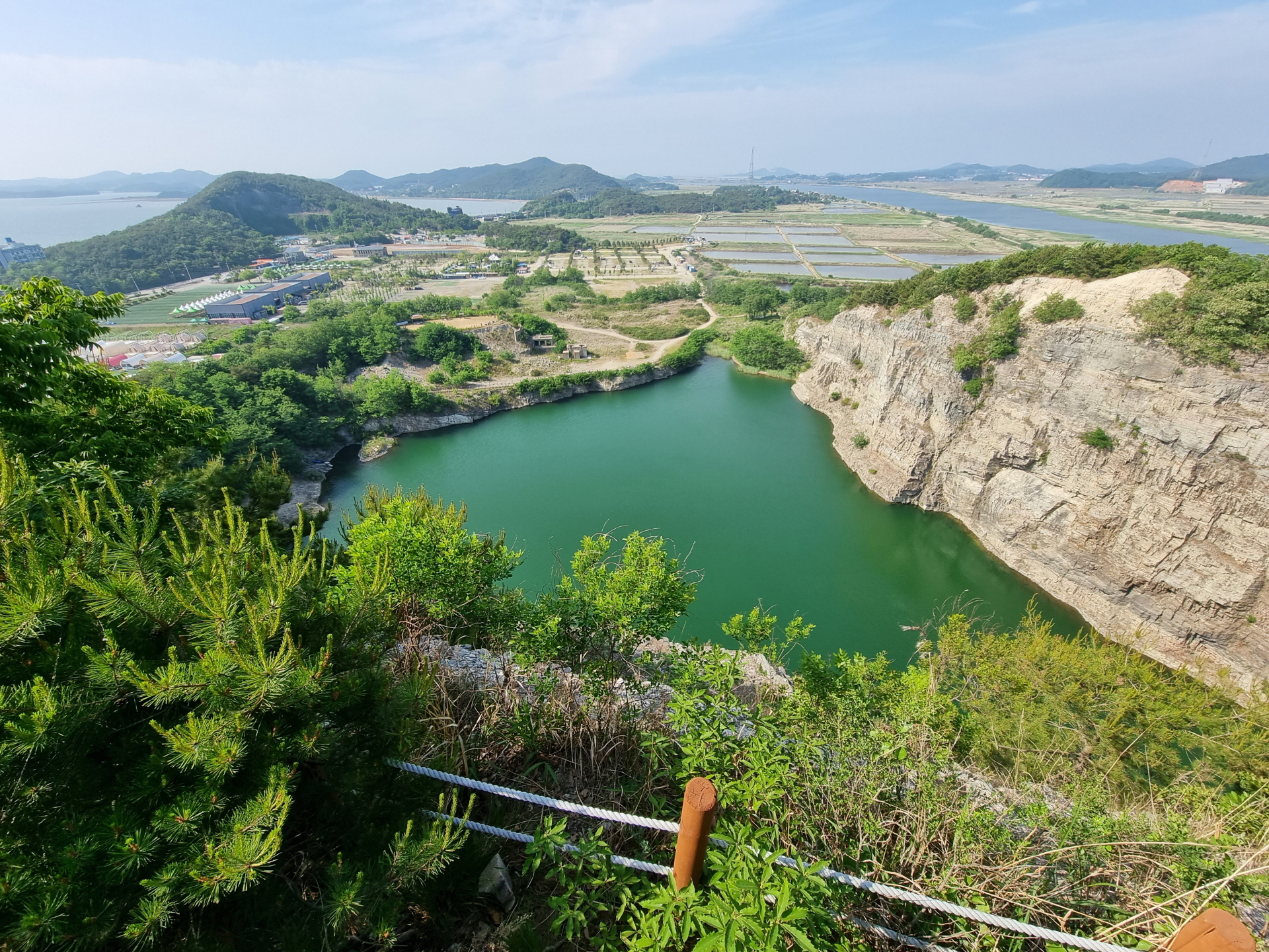 아래 호수와 퇴적암층이 멀리 서해바다가 가슴 탁 트이게 보입니다~