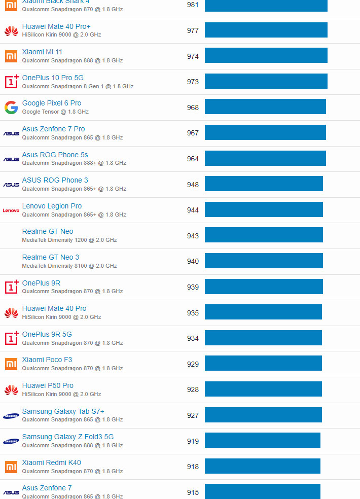 | 21 | OnePlus 10 Pro 5G | Qualcomm Snapdragon 8 Gen 1 @ 1.8 GHz | 973 |