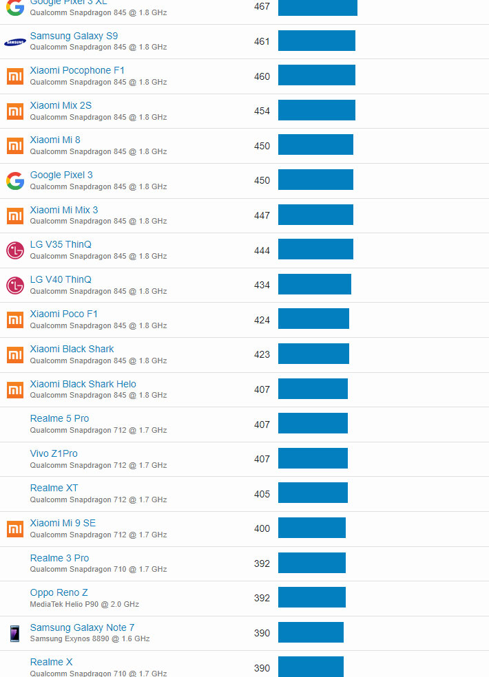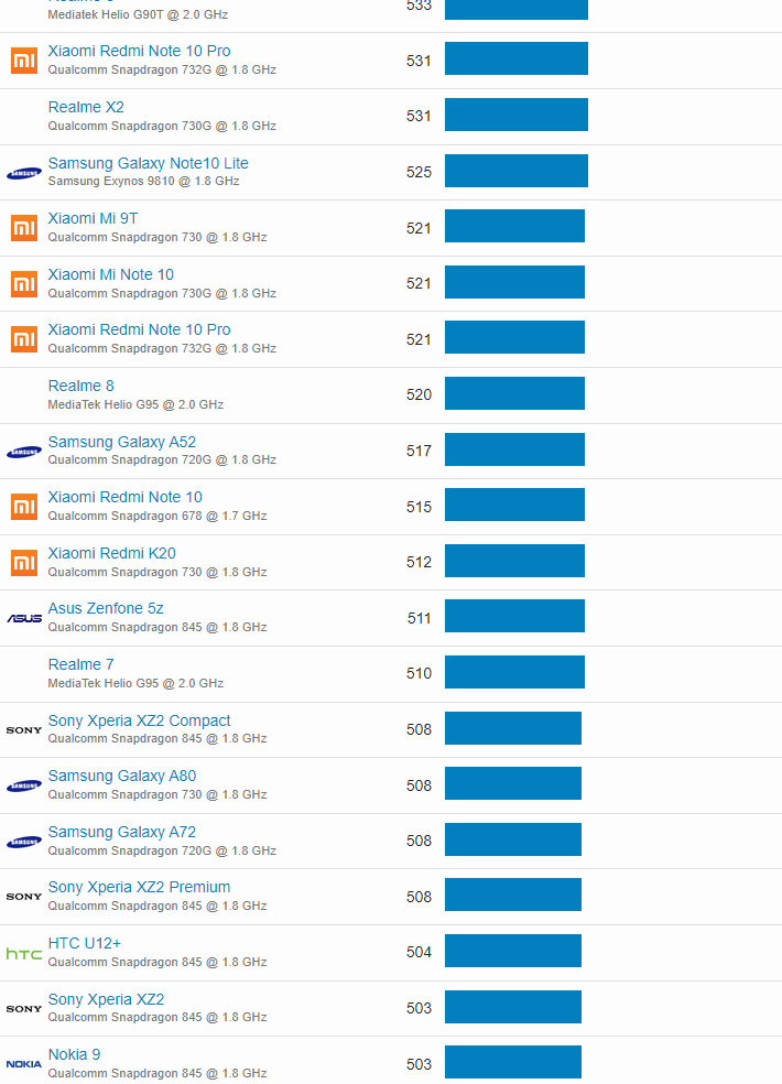 | 78 | Realme X3 | Qualcomm Snapdragon 855+ @ 1.8 GHz | 740 |