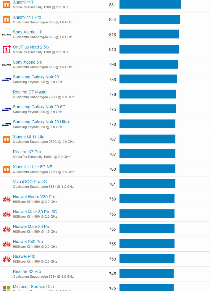 | 20 | Xiaomi Mi 11 | Qualcomm Snapdragon 888 @ 1.8 GHz | 974 |