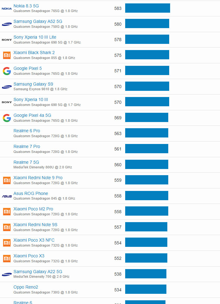 | 82 | OnePlus 7T Pro 5G | Qualcomm Snapdragon 855+ @ 1.8 GHz | 729 |