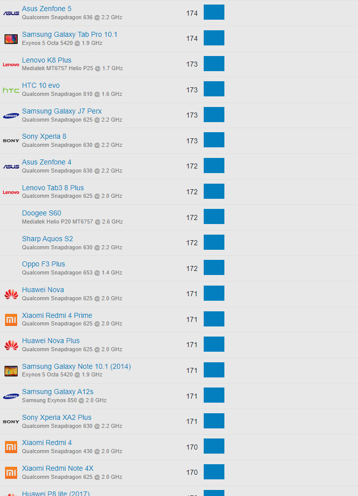 | 630 | Motorola Moto G4 | Qualcomm Snapdragon 617 @ 1.5 GHz | 112 |