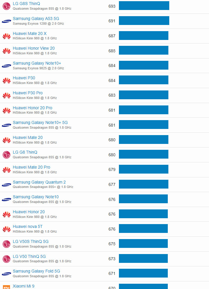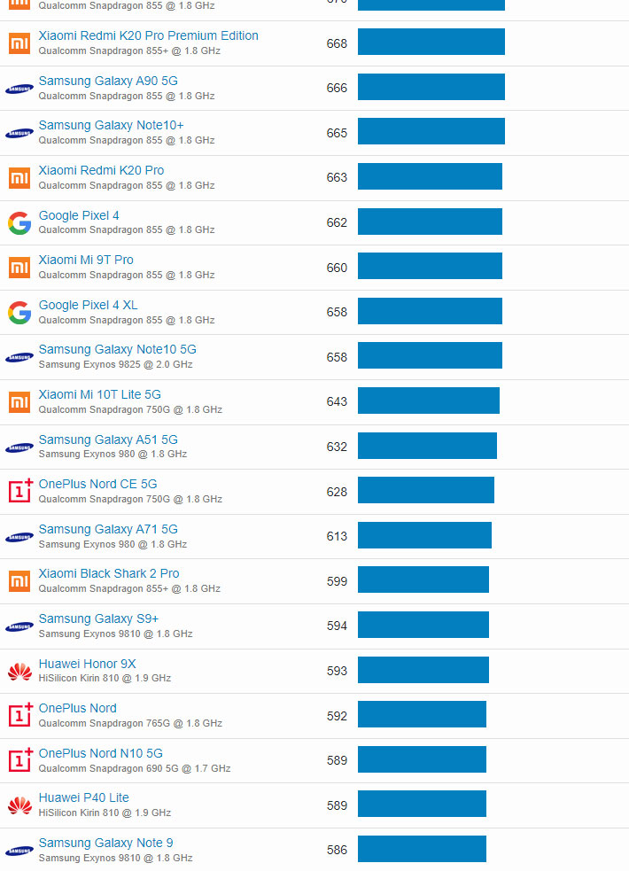 | 70 | Huawei Honor V30 Pro | HiSilicon Kirin 990 @ 2.0 GHz | 759 |
