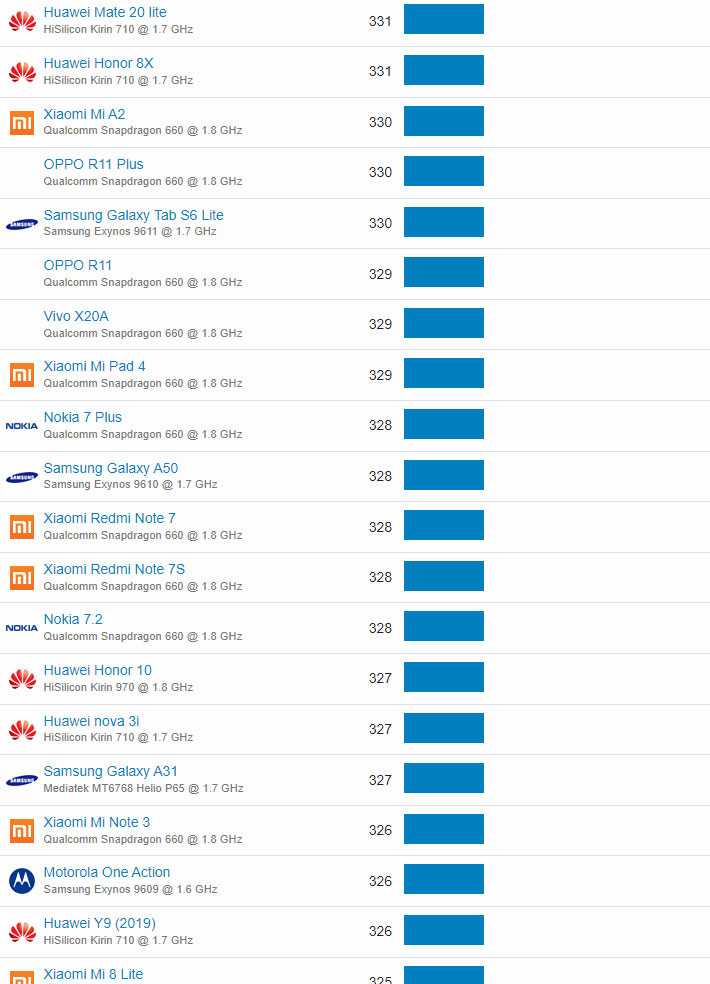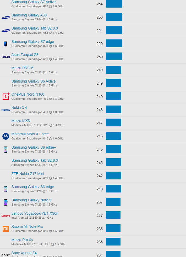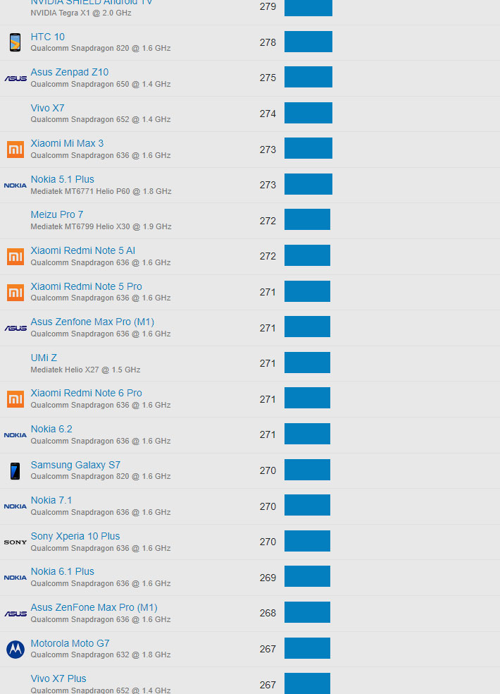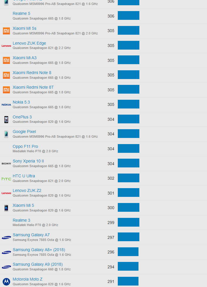 | 642 | Motorola Moto G6 Play | Qualcomm Snapdragon 430 @ 1.4 GHz | 105 |