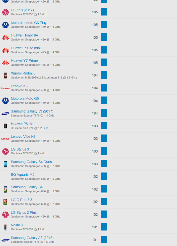 | 652 | LG Stylus 3 | Mediatek MT6750 @ 1.4 GHz | 103 |