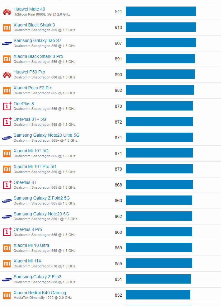 | 38 | Huawei Mate 40 | HiSilicon Kirin 9000E 5G @ 2.0 GHz | 911 |