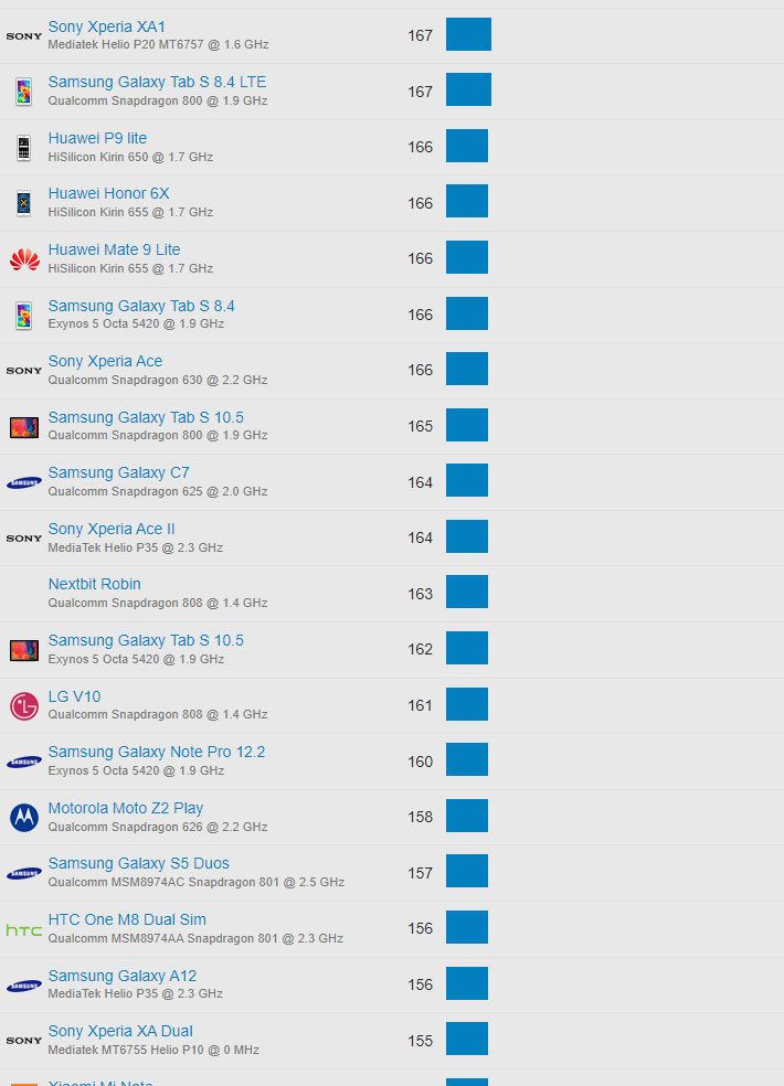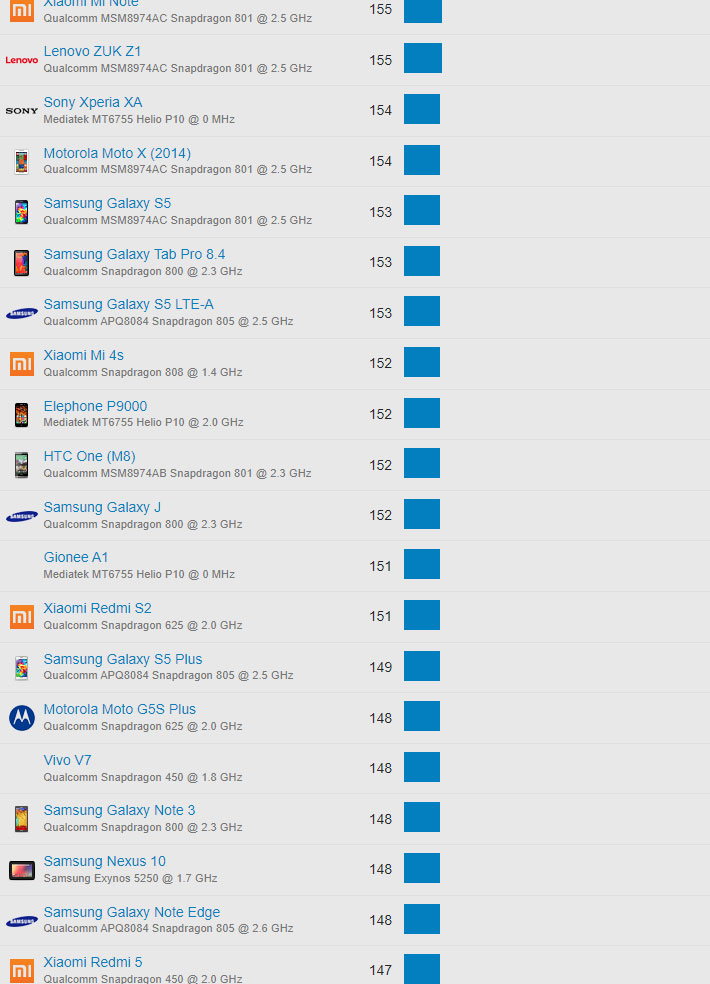 | 624 | Motorola Moto X Play | Qualcomm Snapdragon 615 @ 1.7 GHz | 114 |