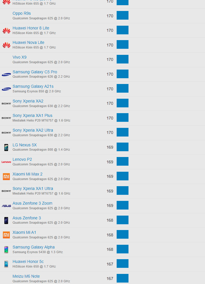| 643 | Huawei Honor 6A | Qualcomm Snapdragon 430 @ 1.4 GHz | 105 |
