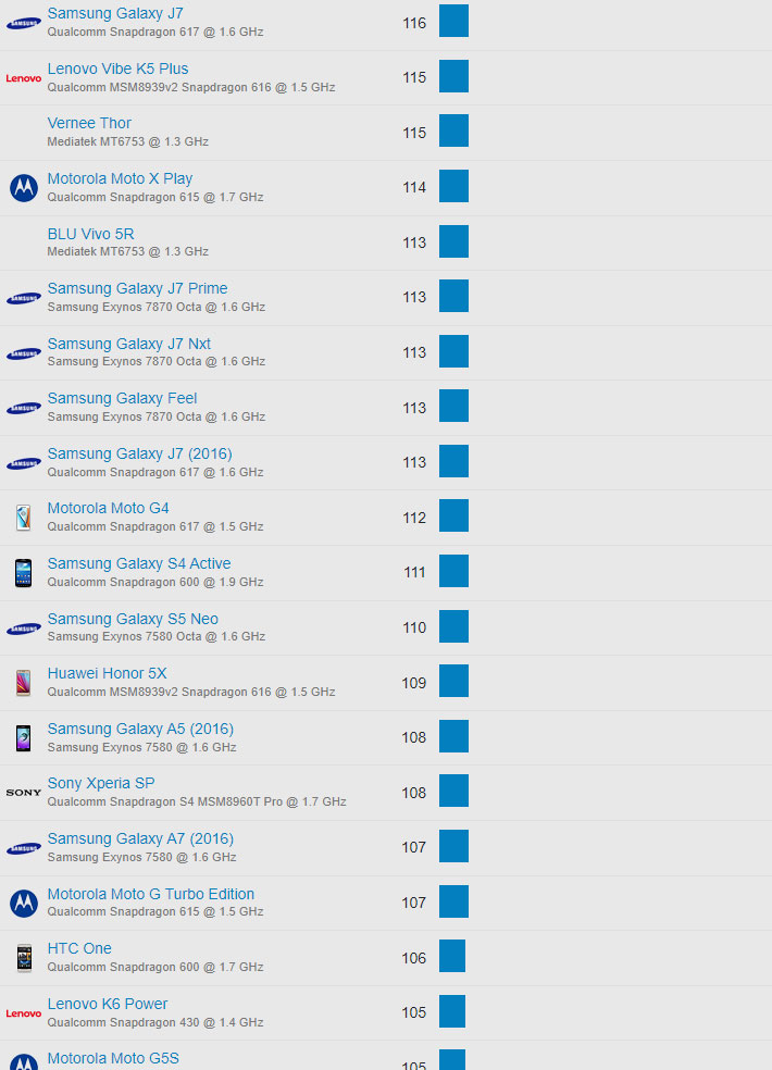 | 621 | Samsung Galaxy J7 | Qualcomm Snapdragon 617 @ 1.6 GHz | 116 |