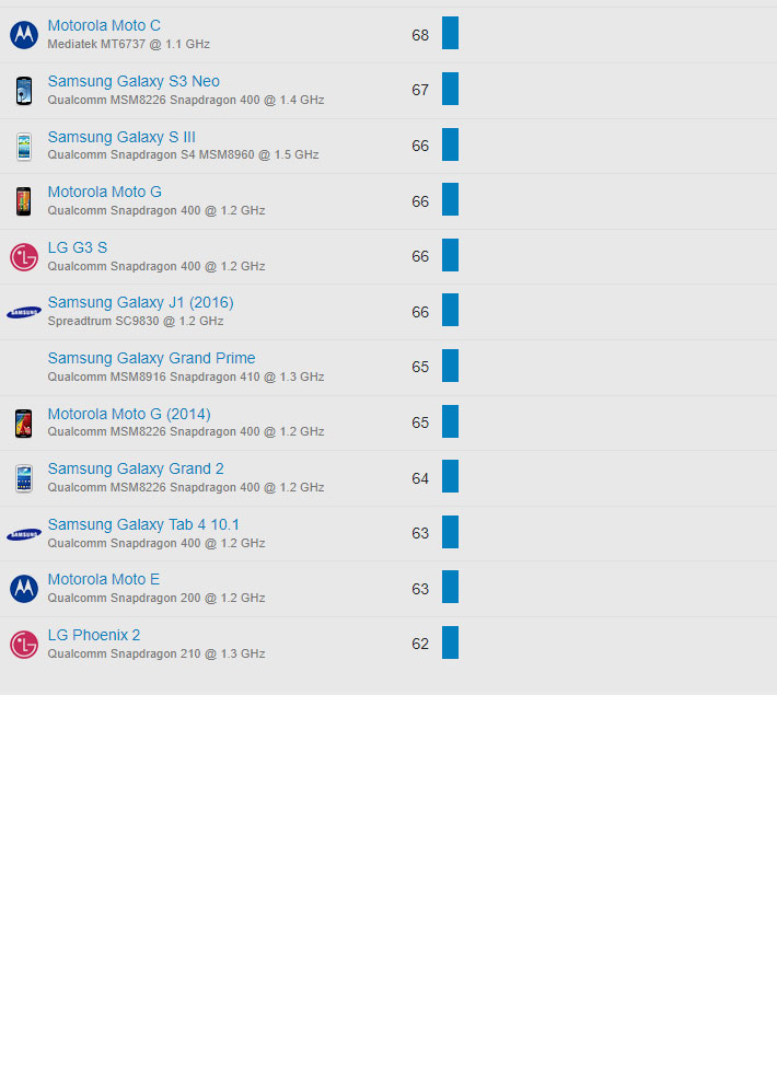 | 702 | Motorola Moto G | Qualcomm Snapdragon 400 @ 1.2 GHz | 66 |
