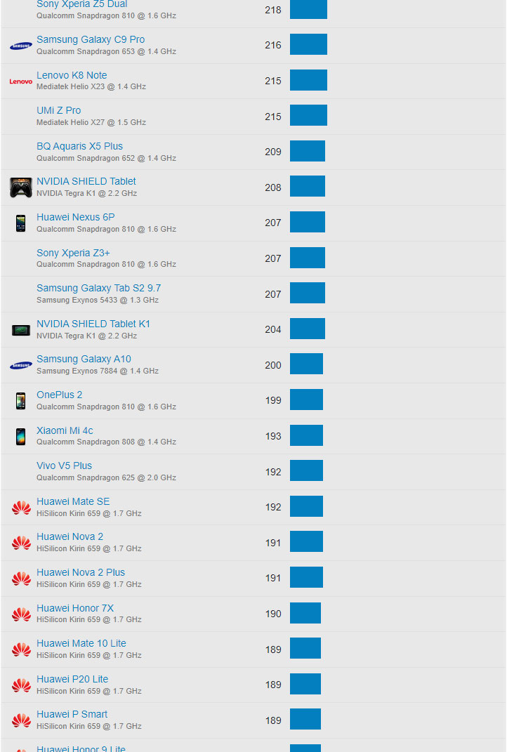 | 644 | Huawei Honor 6A | Qualcomm Snapdragon 430 @ 1.4 GHz | 105 |