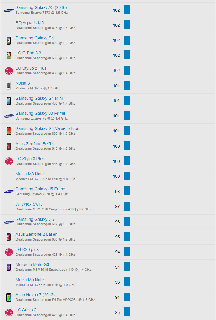 | 652 | LG Stylus 3 | Mediatek MT6750 @ 1.4 GHz | 103 |