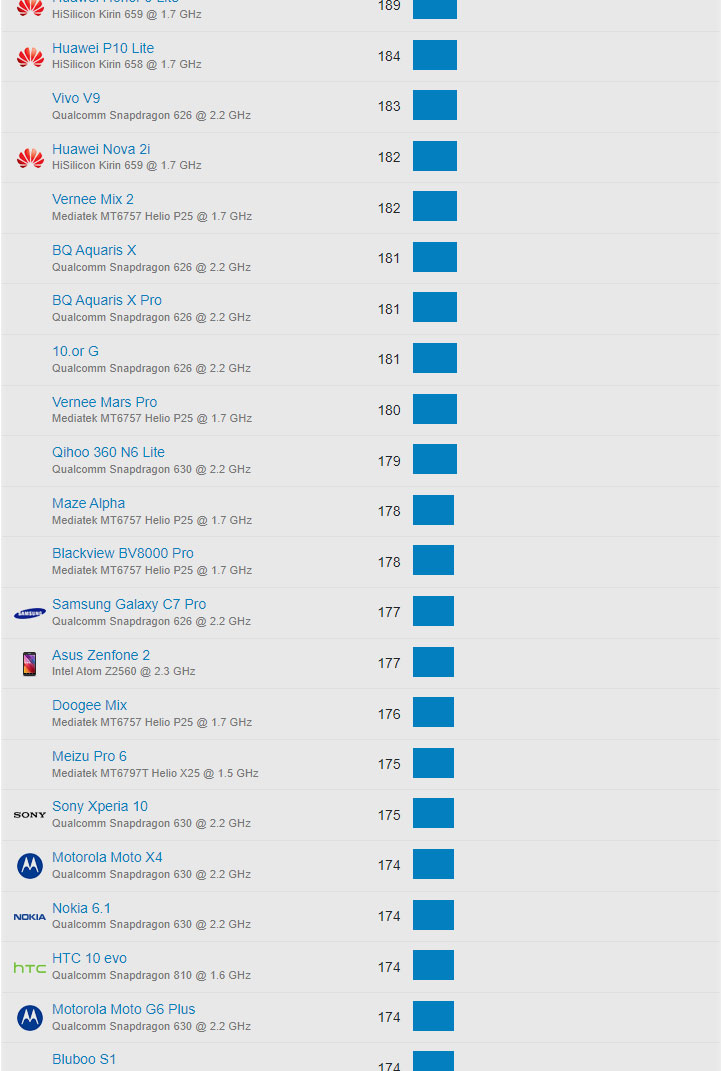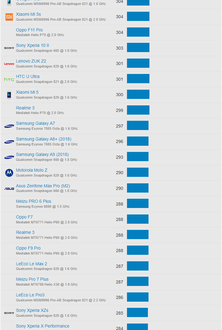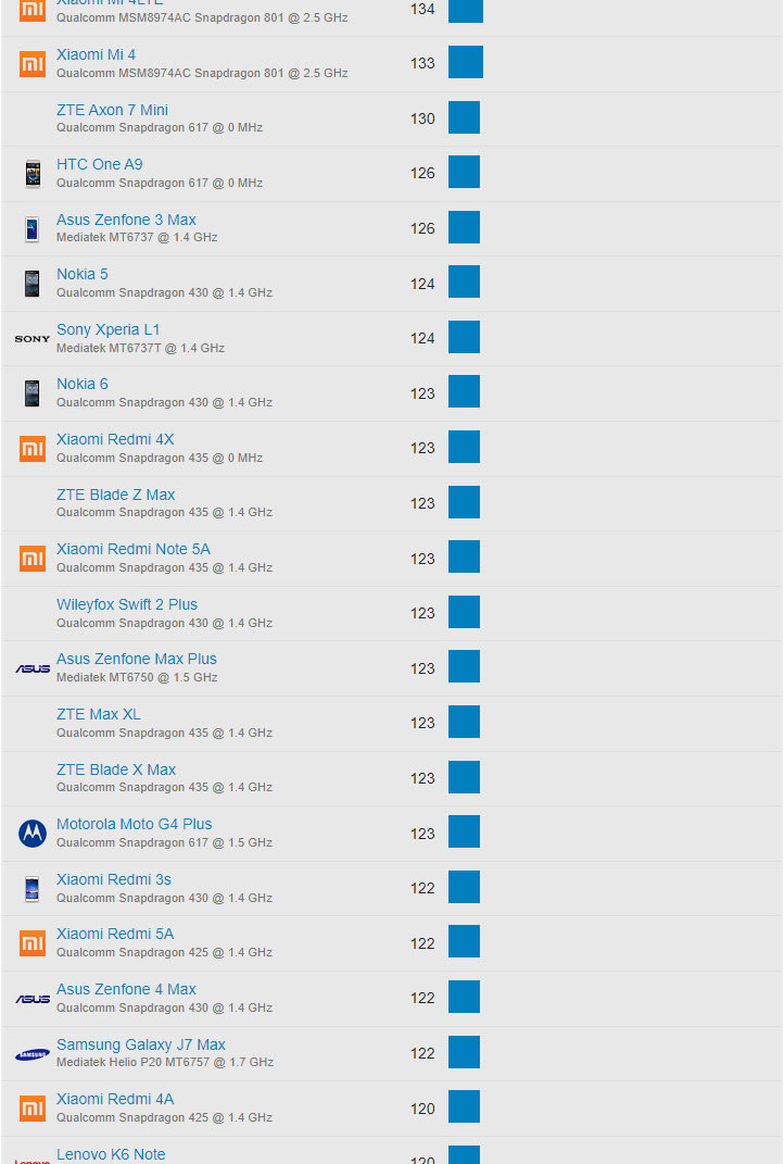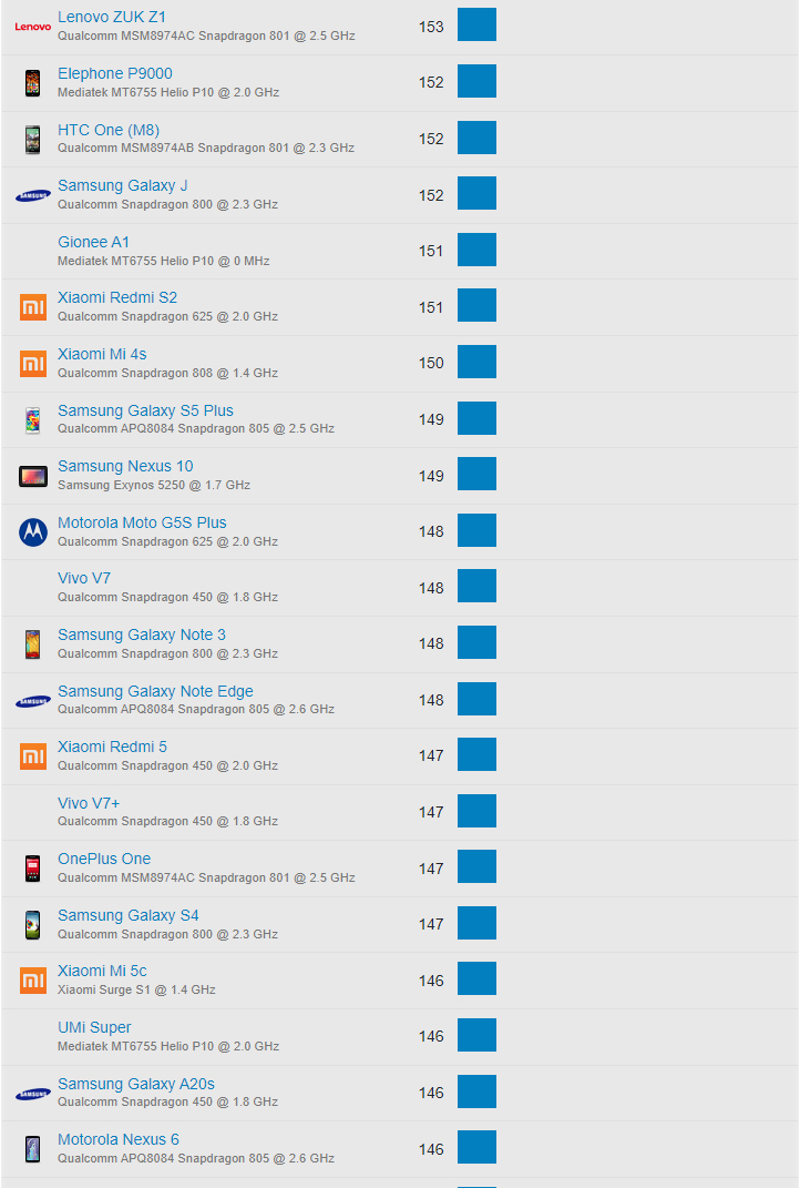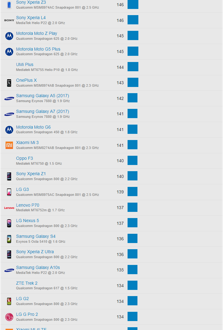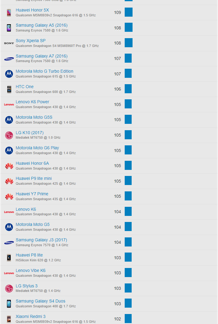 | 641 | Motorola Moto G5S | Qualcomm Snapdragon 430 @ 1.4 GHz | 105 |