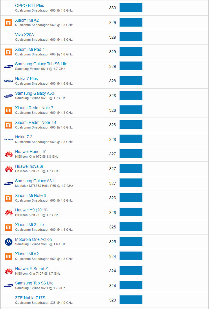 | 643 | Motorola Moto G6 Play | Qualcomm Snapdragon 430 @ 1.4 GHz | 105 |