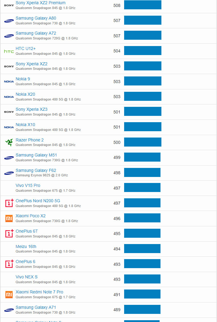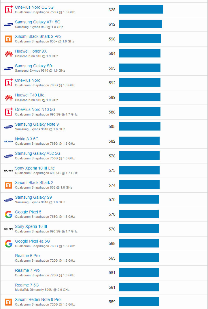 | 82 | OnePlus 7T Pro 5G | Qualcomm Snapdragon 855+ @ 1.8 GHz | 728 |