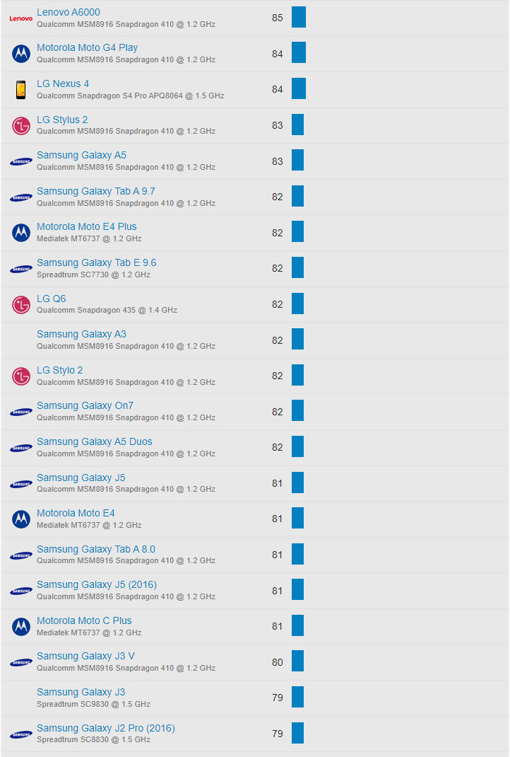 | 692 | Samsung Galaxy J5 (2016) | Qualcomm MSM8916 Snapdragon 410 @ 1.2 GHz | 81 |