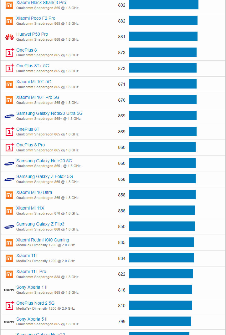 | 17 | Xiaomi Black Shark 4 | Qualcomm Snapdragon 870 @ 1.8 GHz | 978 |