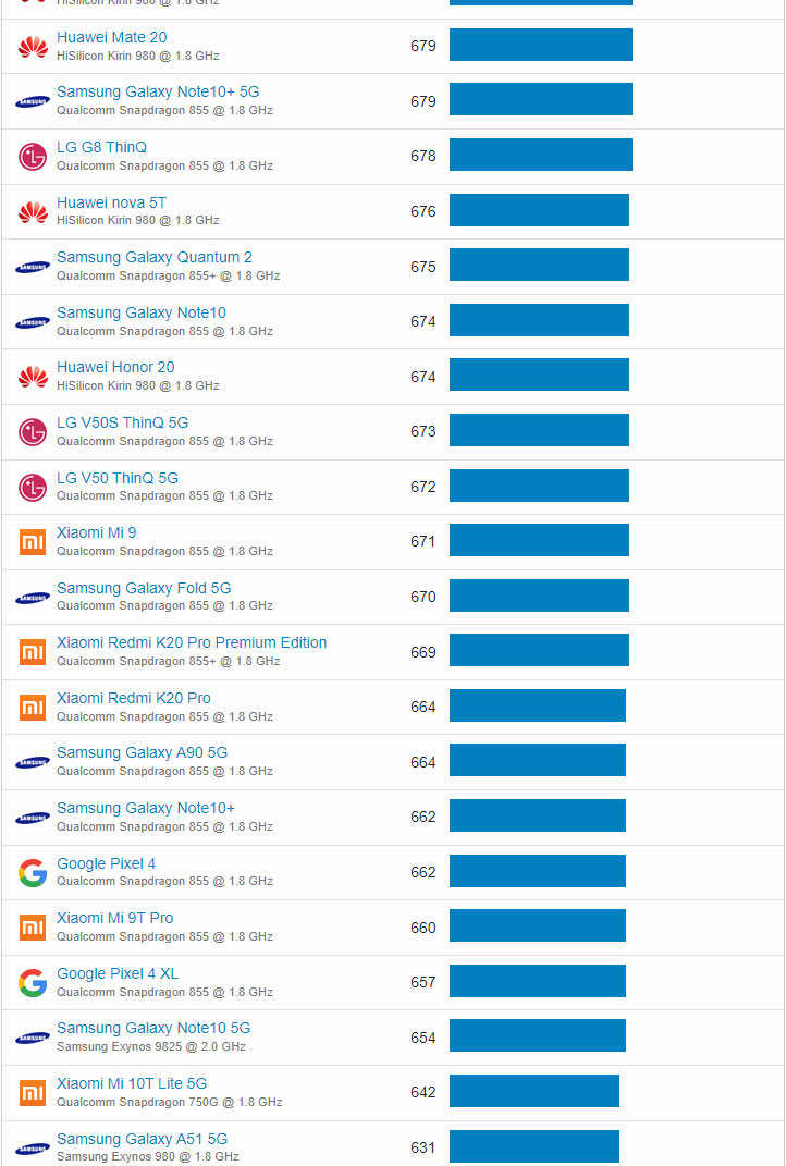 | 69 | Huawei Honor V30 Pro | HiSilicon Kirin 990 @ 2.0 GHz | 758 |