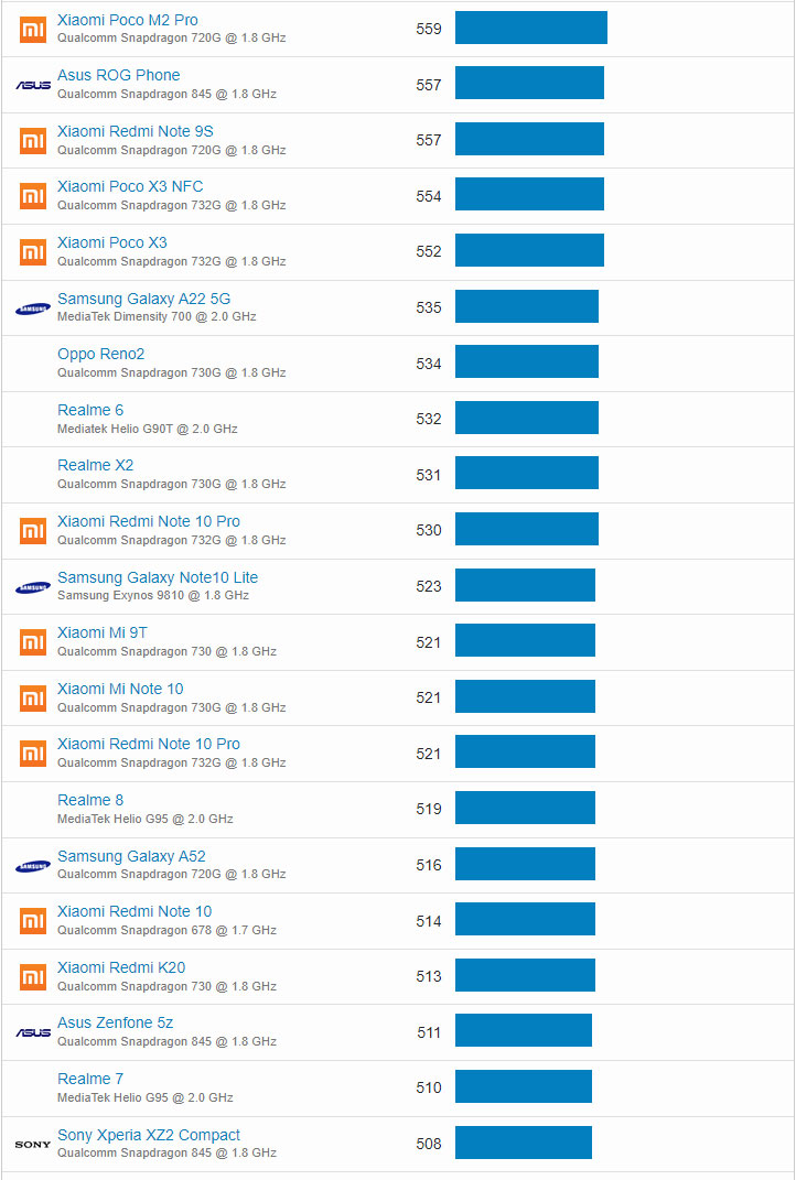 | 54 | Xiaomi Mi 11X | Qualcomm Snapdragon 870 @ 1.8 GHz | 856 |