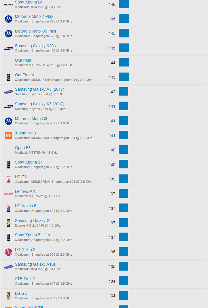 | 643 | Motorola Moto G6 Play | Qualcomm Snapdragon 430 @ 1.4 GHz | 105 |